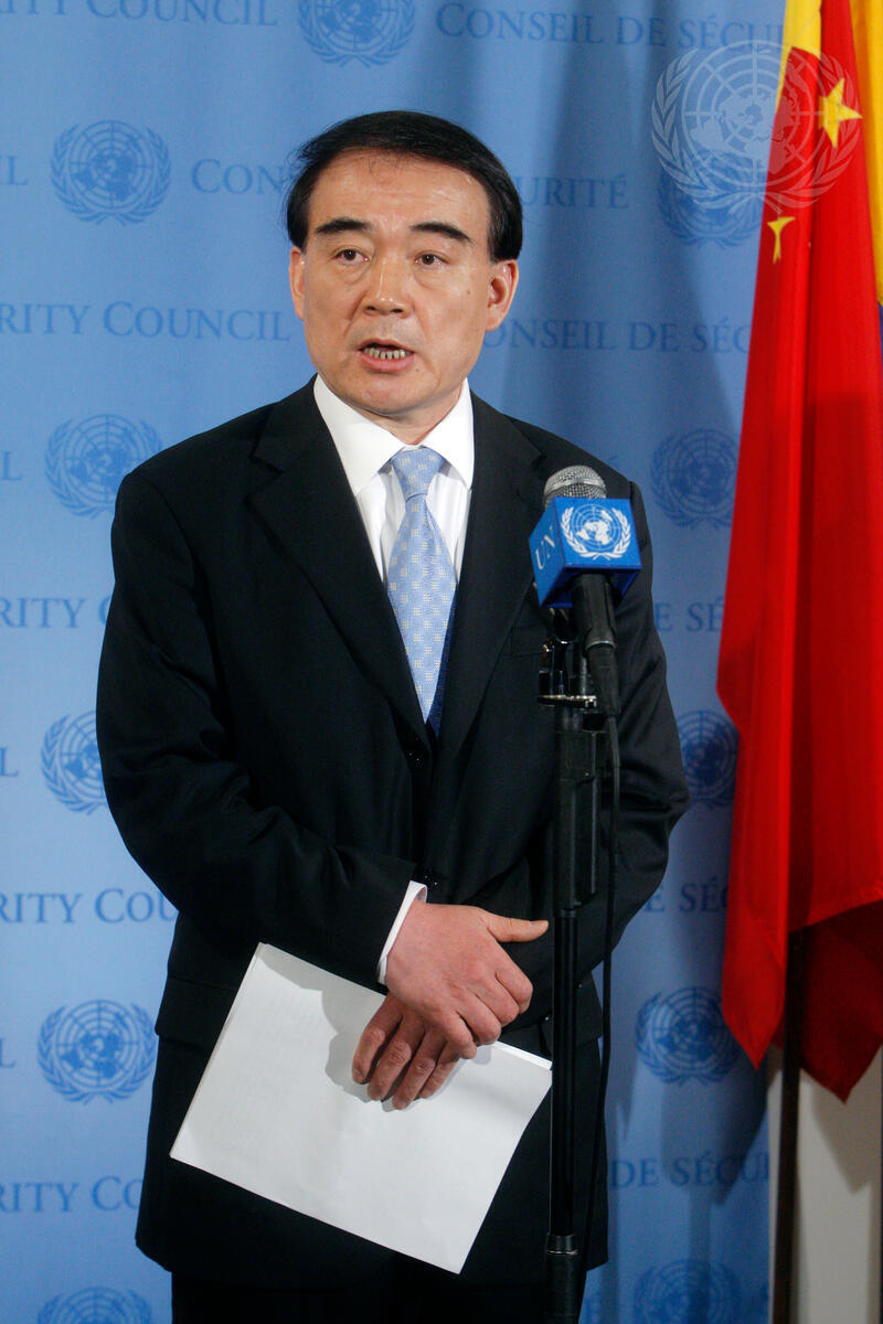 Li Baodong, Permanent Representative of the People’s Republic of China to the UN and President of the Security Council for March, briefs reporters following the Council’s consultations on the Committee established pursuant to resolution 1591 (2005), known as the Sudan Sanctions Committee.