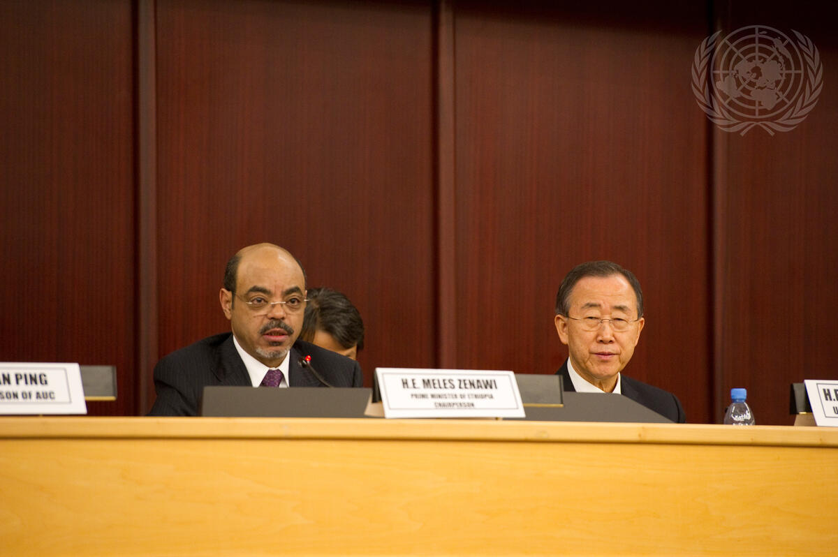 Meles Zenawi (left), Prime Minister of the Federal Democratic Republic of Ethiopia, addresses a high-level meeting on Sudan and Somalia, on the margins of the African Union Summit in Addis Ababa, Ethiopia. Pictured with Mr. Zenawi is Secretary-General Ban Ki-moon.