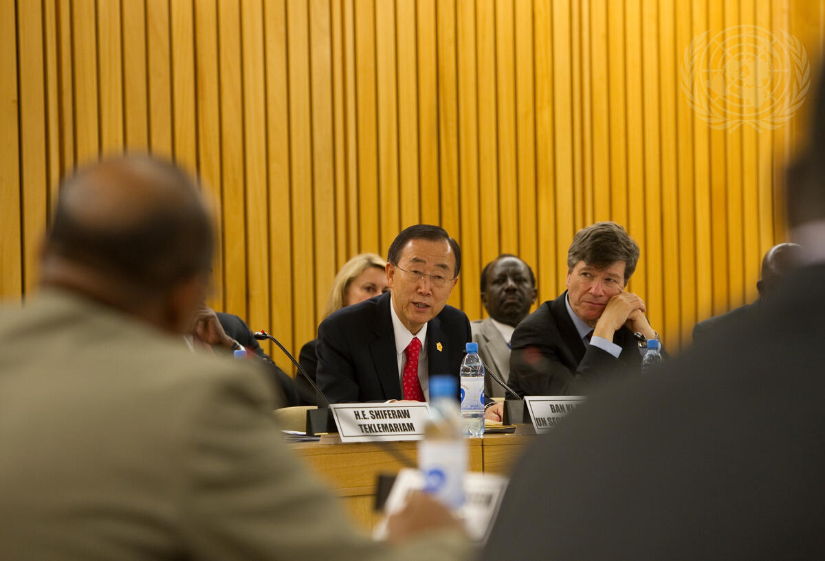 Secretary-General Ban Ki-moon (left) speaks at an event on drylands and pastoral populations hosted by Jeffrey Sachs (right), his Special Adviser on the Millennium Development Goals (MDGS) and Director of Columbia University’s Earth Institute, in Addis Ababa, Ethiopia.