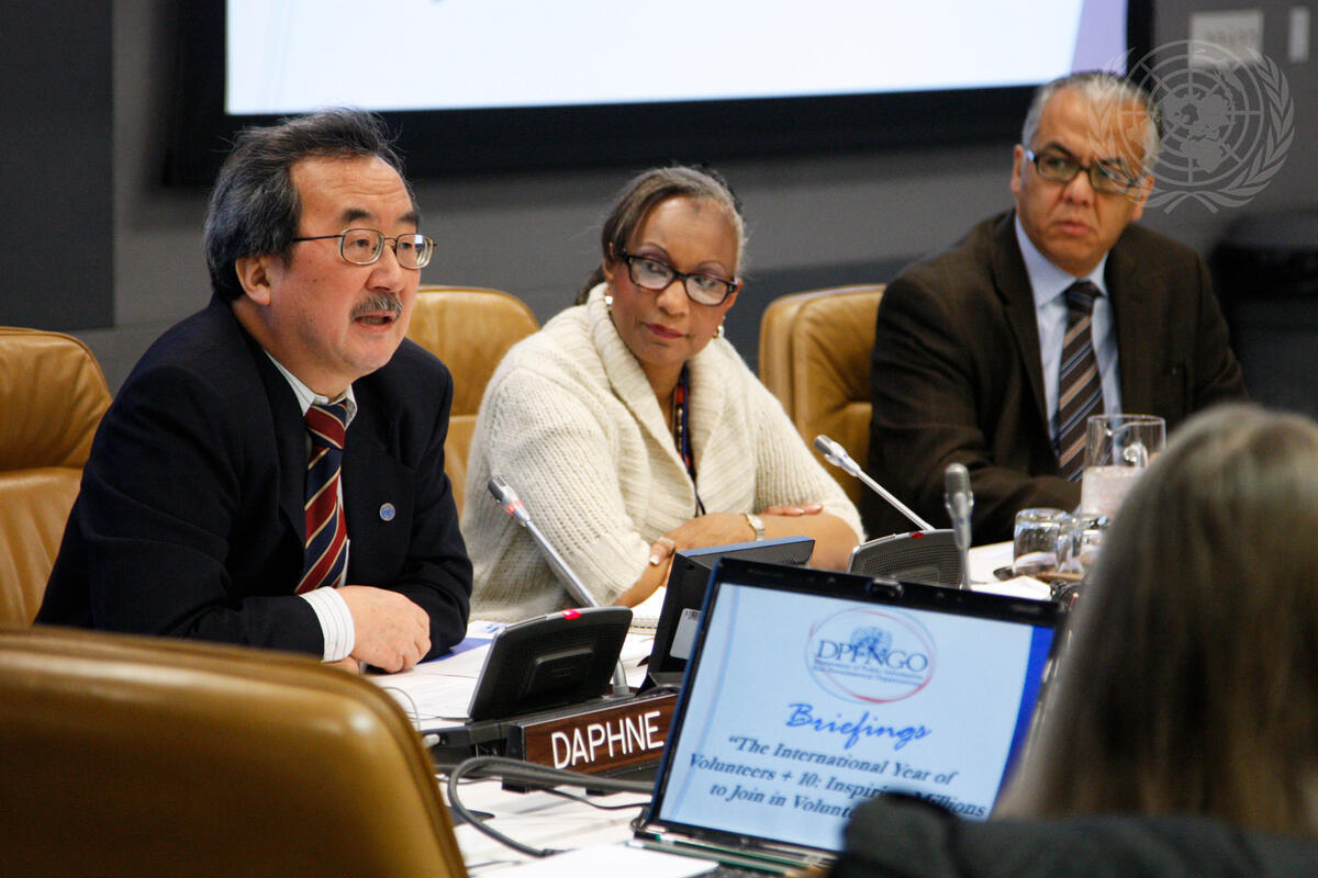 Kiyotaka Akasaka (left), Under-Secretary-General for Communications and Public Information, moderates the briefing, “The International Year of Volunteers +10: Inspiring millions to join in volunteer action"", organized by the UN Department of Public Information and Non-Governmental Organizations (DPI/ NGO).