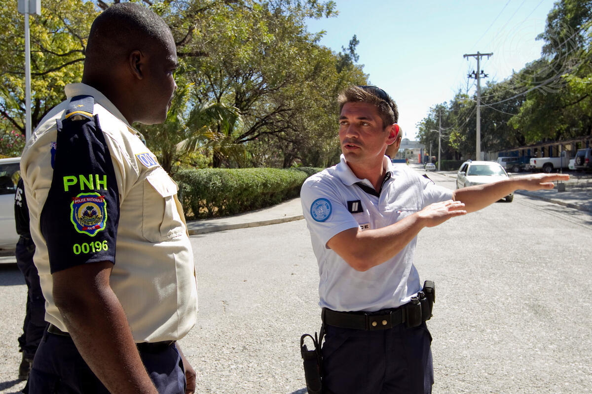 A United Nations police officer from France speaks to a trainee officer during the skills enhancement exercise for Haitian National Police officers being conducted by the United Nations Stabilization Mission in Haiti (MINUSTAH).