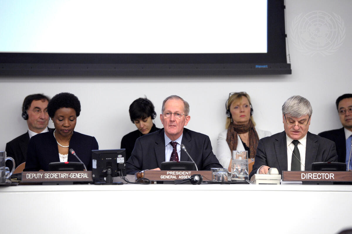 Jospeh Deiss (centre), President of the sixty-fifth session of the General Assembly, chairs the Assembly’s interactive dialogue with the Secretary-General’s High-level Panel on Global Sustainability. He is flanked by Deputy Secretary-General Asha-Rose Migiro (left) and Ion Botnaru, Director of the General Assembly and ECOSOC Affairs Division of the Department for General Assembly and Conference Management.