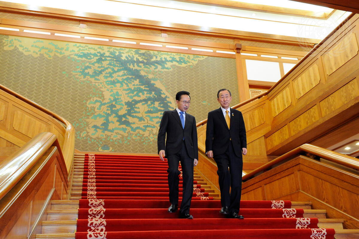 Secretary-General Ban Ki-moon (right) converses with Lee Myung-bak, President of the Republic of Korea, at Cheong Wa Dae, or the Blue House, the office and official residence of the President, in Seoul, Republic of Korea.