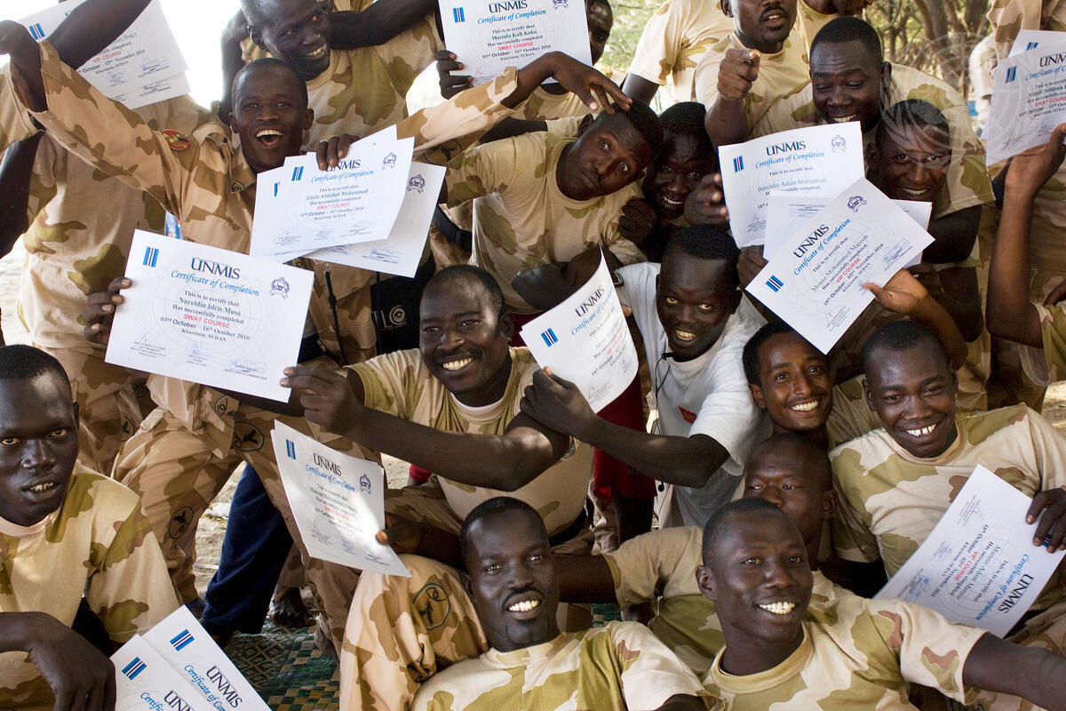 Police officers in Khartoum, Sudan, hold up their certificates after receiving Special Weapons And Tactics (SWAT) and VIP protection training courses from UN Police (UNPOL). The officers are training in preparation for Sudan’s 9 January 2011 referenda which will determine whether Southern Sudan and the region of Abyei remain part of the country.