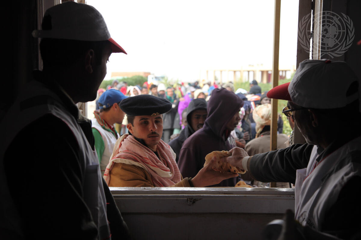 Thousands of refugees—mainly from Bangladesh, Nigeria, Mali and Chad—are distributed food rations in the border town of Sallum, Egypt, after fleeing the ongoing crisis in neighbouring Libya.