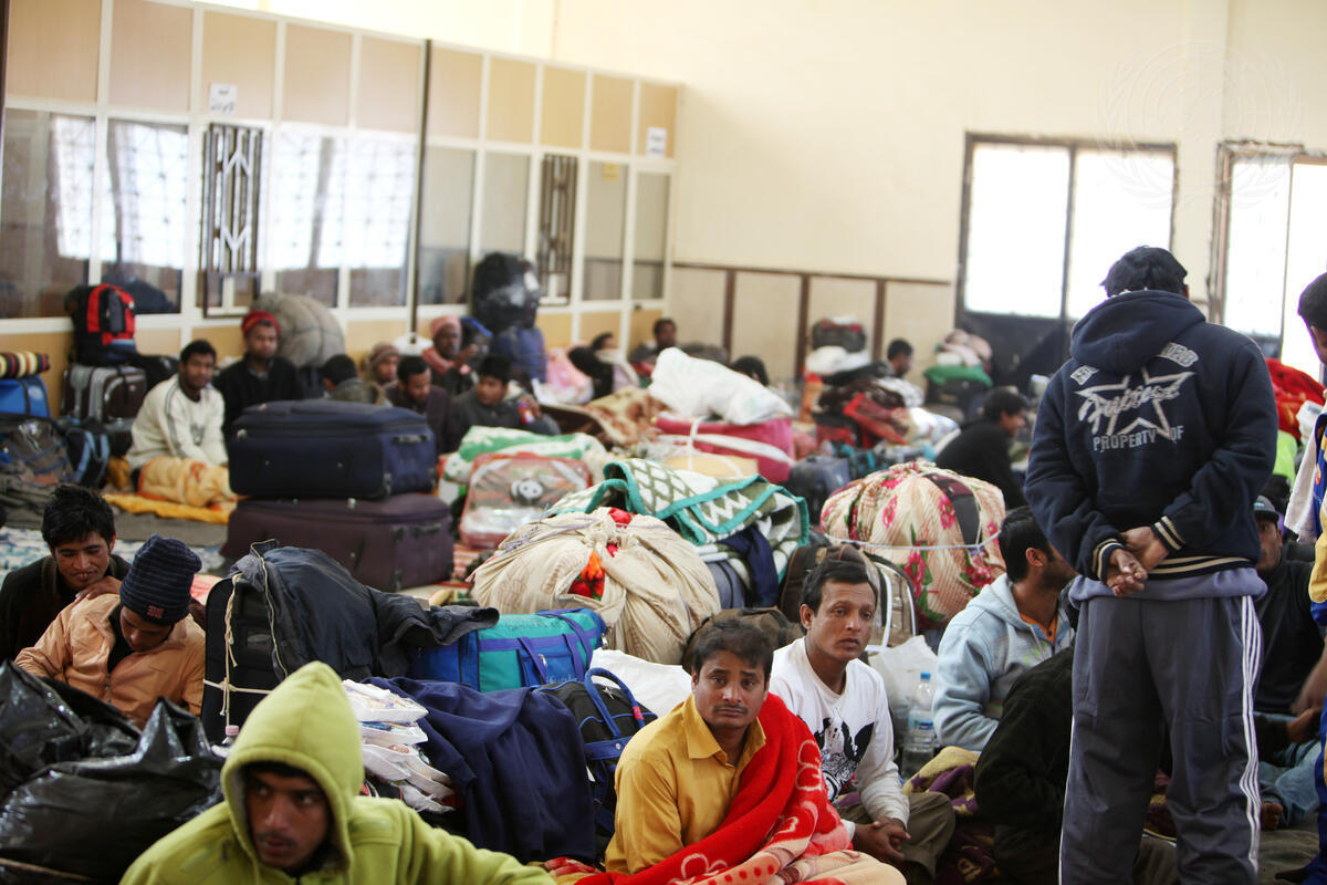 Bangladeshi men, some of whom have been awaiting onward transport for almost two weeks, take shelter in one of the few covered spaces at Sallum Land Port on the Egyptian-Libyan border. Humanitarian assistance is being provided to the almost 5,000 people still at the border who have fled unrest in Libya.