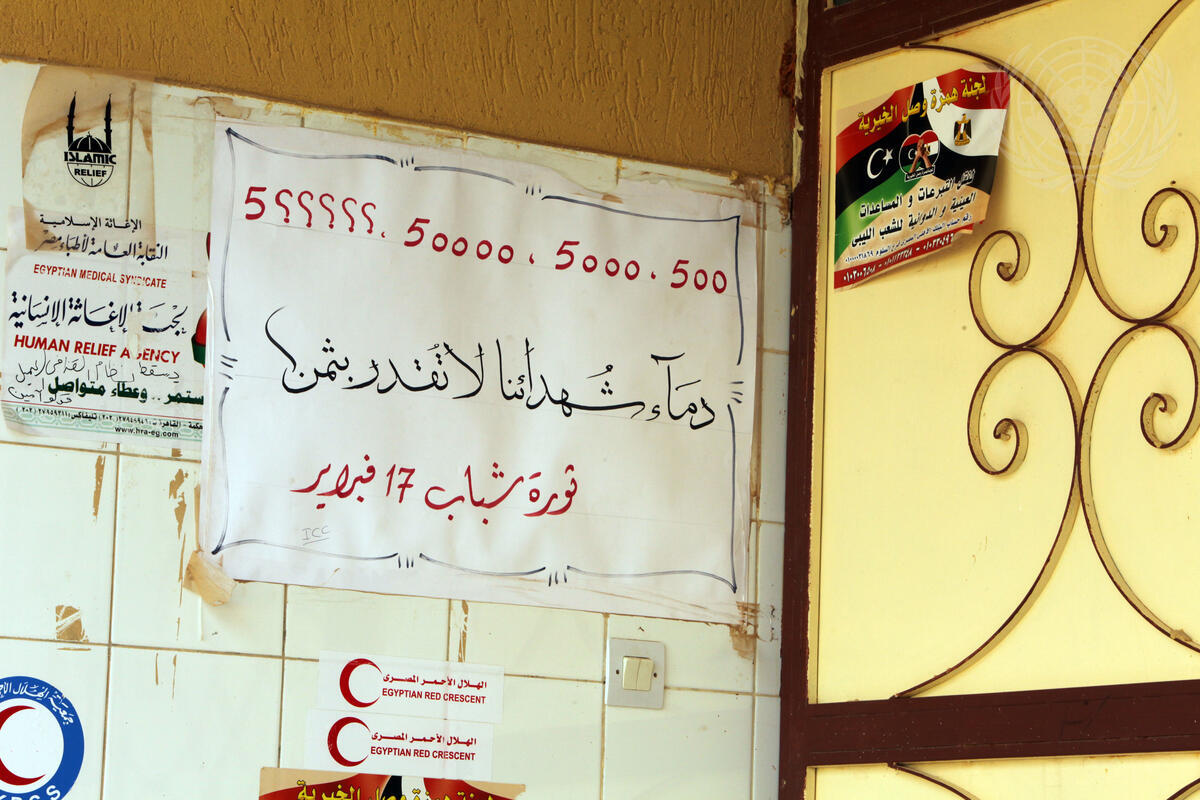 At a Libyan medical facility-turned-aid-warehouse on the border with Egypt, a poster reads “The blood of our Martyrs is priceless. The Revolution of the 17th February Youth”, referring to rebel forces in Libya engaged in an ongoing standoff with the Libyan government. The Libyan-Egyptian border has seen the crossing of thousands of refugees since violence erupted in Libya over two weeks ago.