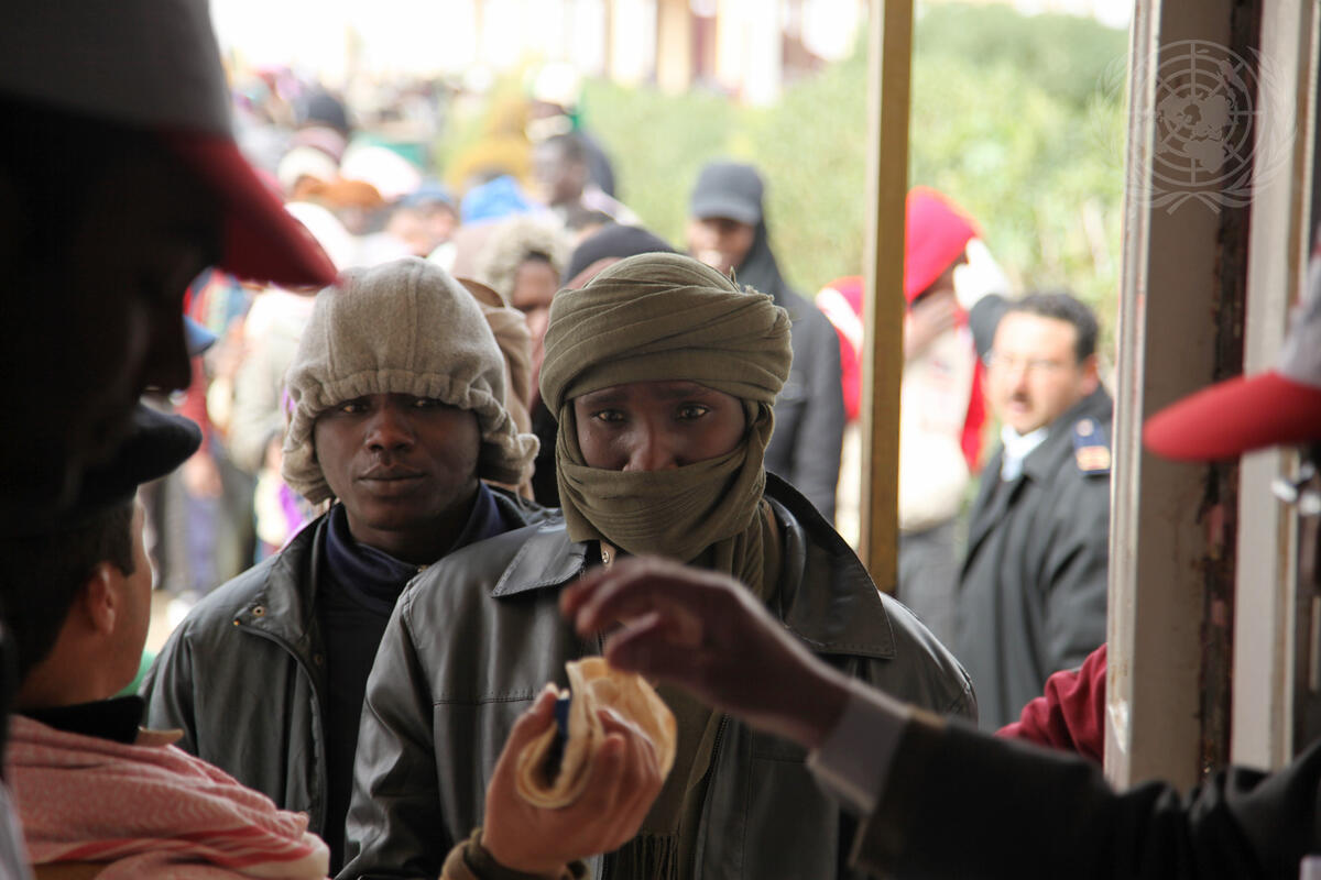 Thousands of refugees—mainly from Bangladesh, Nigeria, Mali and Chad—are distributed food rations in the border town of Sallum, Egypt, after fleeing the ongoing crisis in neighbouring Libya.