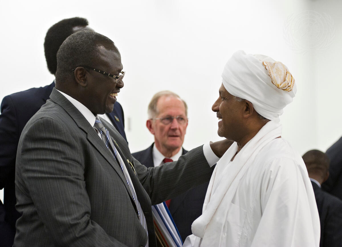 Riek Machar Teny Dhurgon (left), Vice-President of Southern Sudan, greets Daffa-Alla Elhag Ali Osman, Permanent Representative of the Republic of the Sudan to the UN, at an informal meeting of the Economic and Social Council (ECOSOC) and the Peacebuilding Commission on “Promoting durable peace and sustainable development in the Sudan and South Sudan”. Pictured between them is Joseph Deiss, President of the sixty-fifth session of the General Assembly.