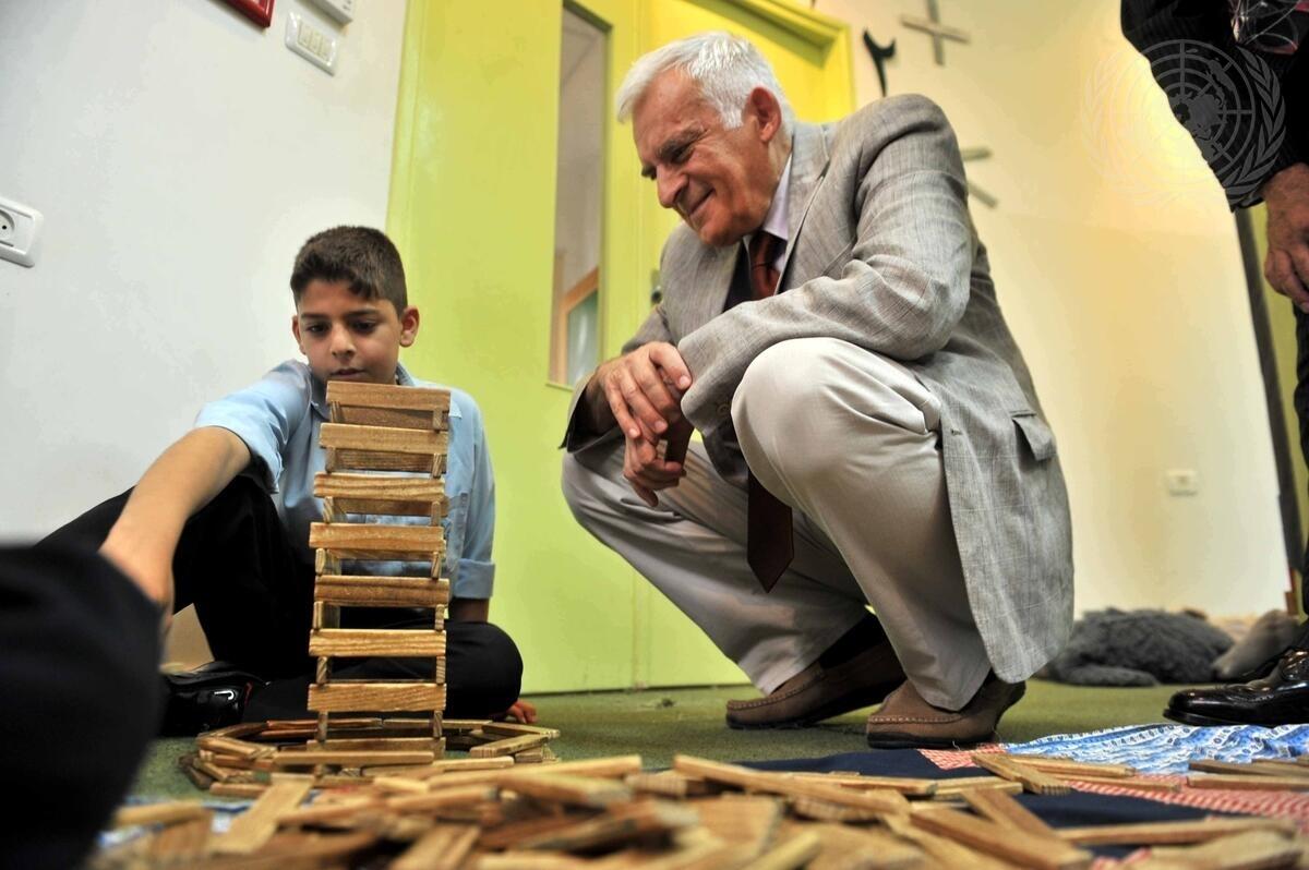 Jerzy Buzek (right), President of the European Parliament, sits with a child at the Atfaluna Society for Deaf Children in Gaza City. The visit is part of Mr. Buzek’s tour of the city, where he also observed a number of projects run by the United Nations Relief and Works Agency for Palestine Refugees in the Near East (UNRWA), and met with UNRWA Commissioner-General Filippo Grandi.