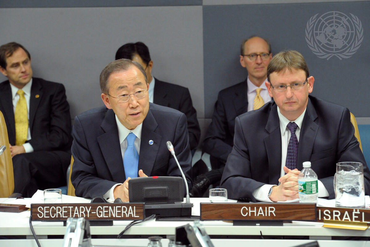 Secretary-General Ban Ki-moon (left) meets with the Group of Western European States and Other States. Haim Waxman, Chair of the Group of Western European States and Other States, and Chargé d’affaires a.i. of the Permanent Mission of Israel to the United Nations, is on the right.