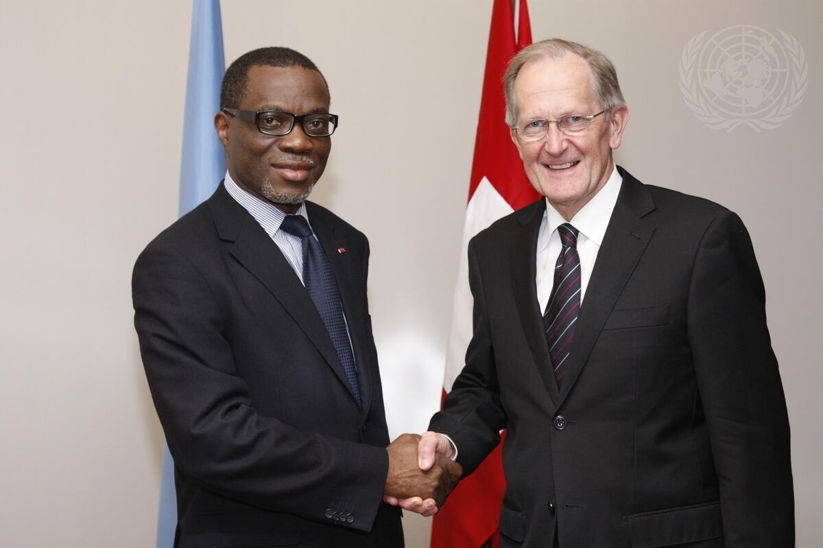 Joseph Deiss (right), President of the sixty-fifth session of the General Assembly, meets with Nelson Messone, Permanent Representative of the Gabonese Republic to the UN and President of the Security Council for the month of June.