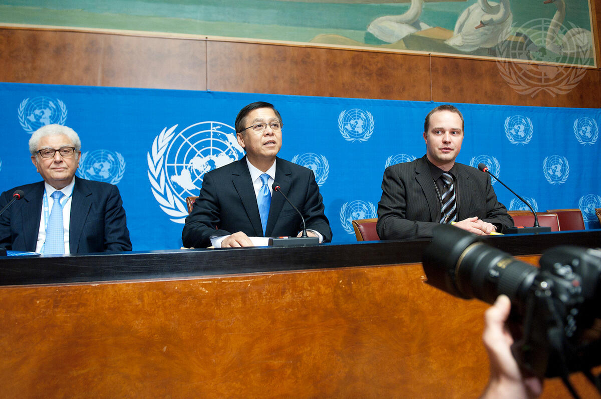 Sihasak Phuangketkeow, President of the Human Rights Council and Permanent Representative of Thailand to the United Nations Office at Geneva, speaks at the press conference. Chérif Bassiouni, Chairperson of the Commission of Inquiry in Libya, is on the left. Cedric Sapey, Spokesman for the Human Rights Council, is on the right. The press conference is held following the Human Rights Council's interactive dialogue on the report of the International Commission of Inquiry to investigate all alleged violations of international human rights law in Libya.