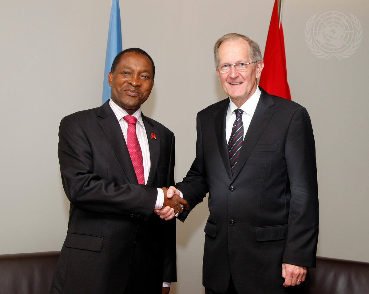 Joseph Deiss (right), President of the sixty-fifth session of the General Assembly, meets with Aires Bonifacio Baptista Ali, Prime Minister of the Republic of Mozambique.