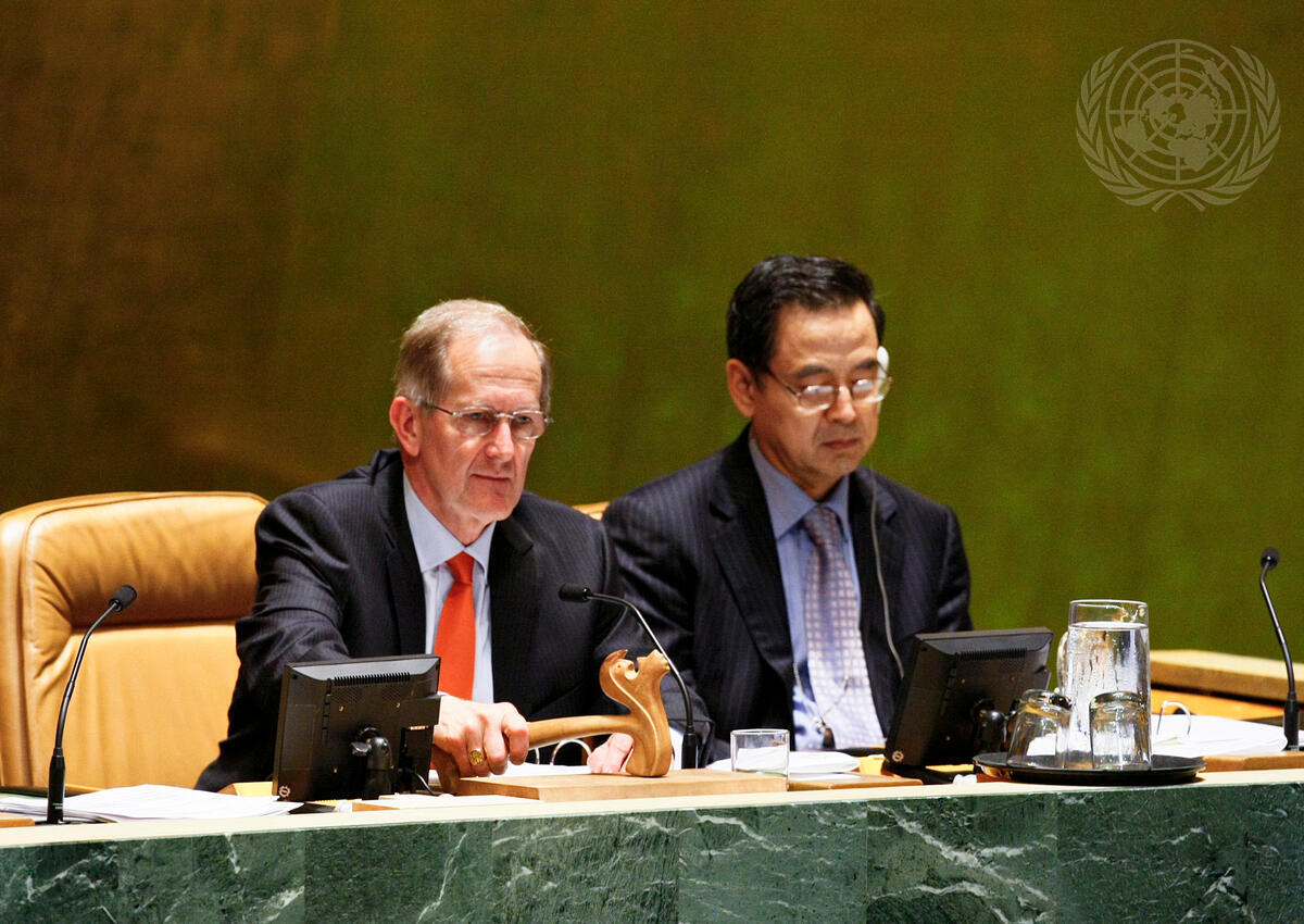 Joseph Deiss (left), President of the sixty-fifth session of the General Assembly, adjourns the Assembly's 8-10 June High-Level Meeting on HIV/AIDS. The Summit adopted a consensus outcome document, which sets the course for the global response to HIV/AIDS over the next decade. At right is Zhang Saijin, Chief of the General Assembly Affairs Branch in the Department for General Assembly and Conference Management.
