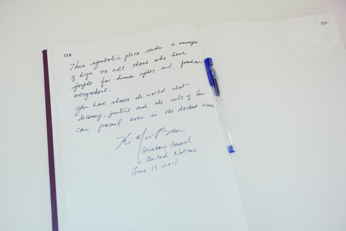 The guestbook signed by Secretary-General Ban Ki-moon at the entrance of the Center for the Promotion of Human Rights, in Buenos Aires, Argentina. The Center was formerly a notorious detention centre, Escuela Superior de Mecánica de la Armada (ESMA), used by Argentina’s military government in the late 1970’s and early 80’s.