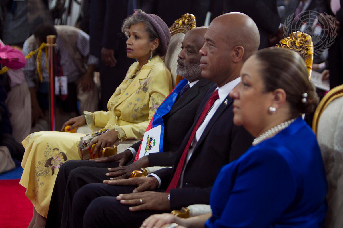 Michel Joseph Martelly (second from right), President of Haiti, sits next to René Préval, former President of Haiti, during Mr. Martelly's swearing-in ceremony.