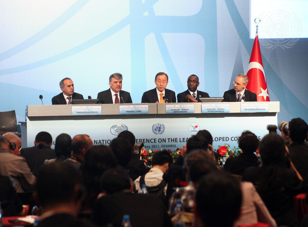Secretary-General Ban Ki-moon (centre) speaks at a press conference following the opening of the Fourth UN Conference on the Least Developed Countries (LDC-IV), held 9-13 May, in Istanbul, Turkey. He is flanked by Abdullah Gül (second from left), President of Turkey, and Cheick Sidi Diarra, Secretary-General of the Conference and UN High Representative for the Least Developed Countries, Landlocked Developing Countries and Small Island Developing States.