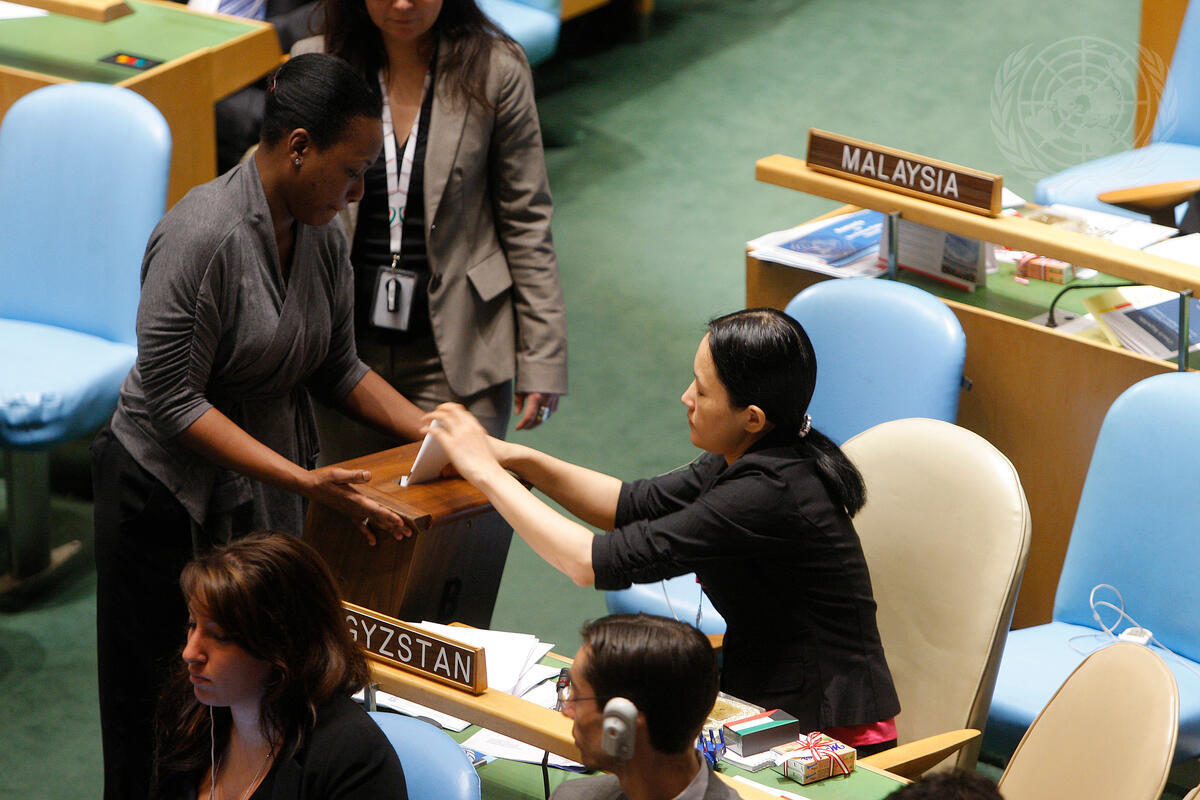 A delegate from Kyrgyzstan submits her ballot during the General Assembly’s election of Member States to the Human Rights Council. The Assembly elected 15 States, including Austria, Benin, Botswana, Congo, Costa Rica and Kuwait, who will serve on the Geneva-based Council for the first time.