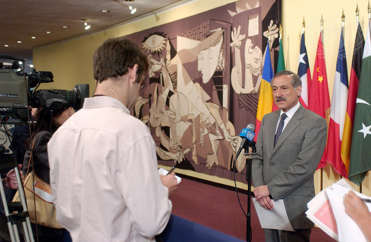 "Ambassador Heraldo Munoz (right), Permanent Representative of Chile, addresses the press outside the Security Council chamber following