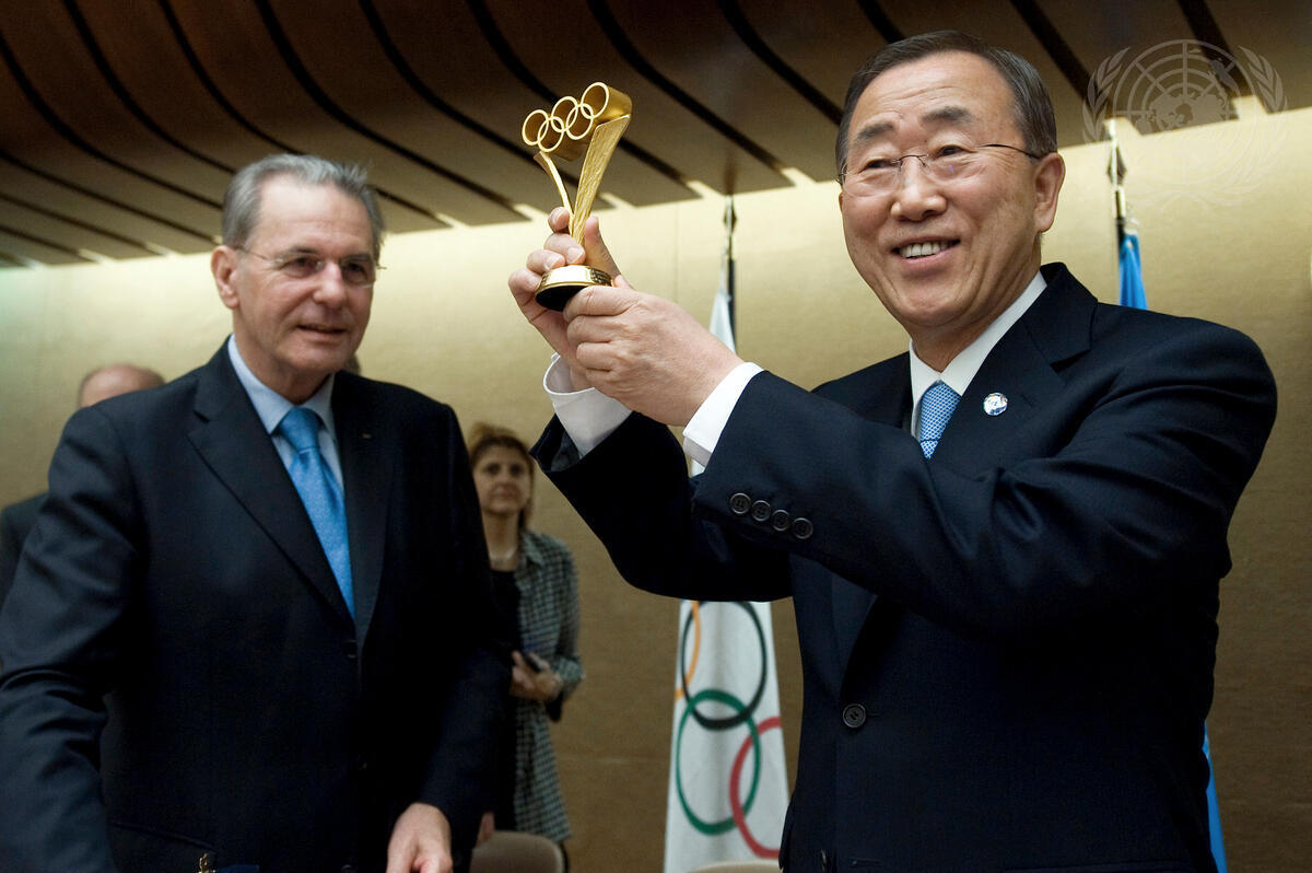 Secretary-General Ban Ki-moon holds up an Olympic trophy at the 2nd International Forum on Sport, Peace and Development, in Geneva, Switzerland. With him is Jacques Rogge (left), President of the International Olympic Committee (IOC).