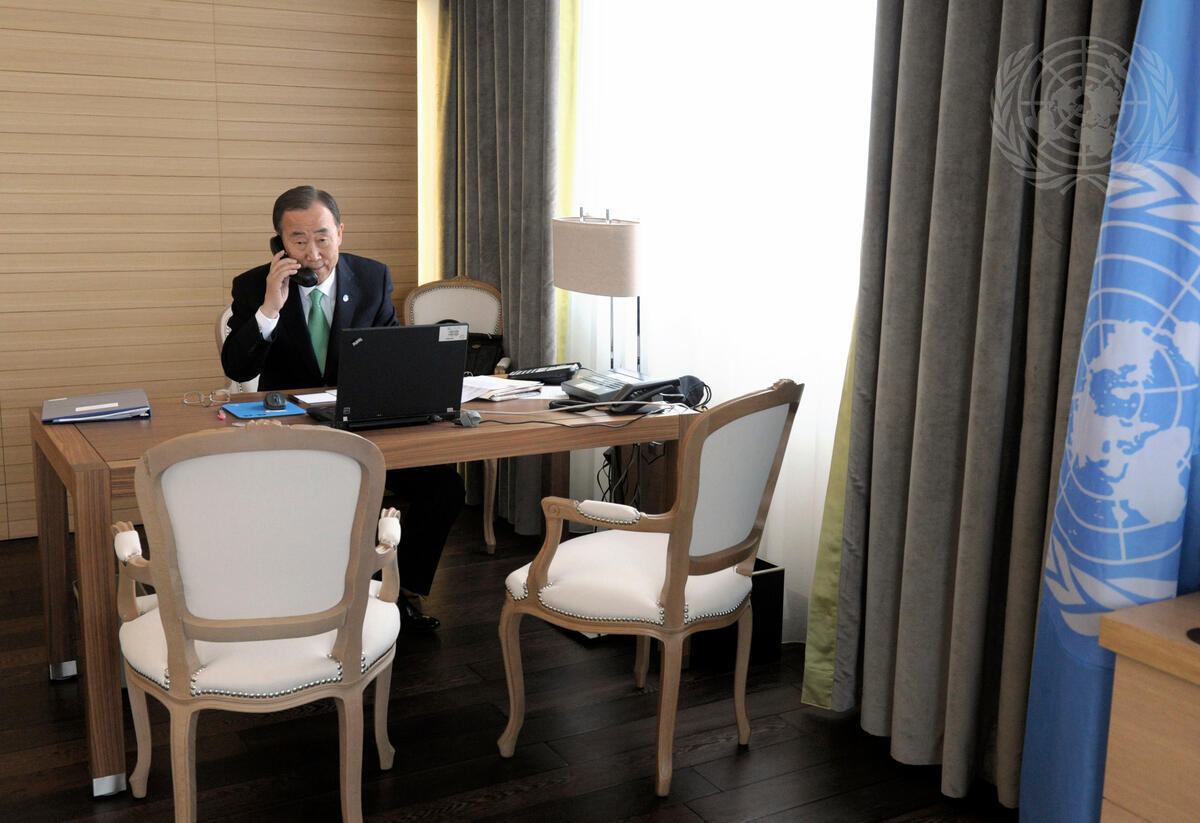 Secretary-General Ban Ki-moon speaks on the phone with Al Baghdadi Ali Al-Mahmoudi, Prime Minister of the Libyan Arab Jamahiriya, as the violent standoff between government and opposition forces in that country continues. At the time of the phone call Mr. Ban was in Geneva, Switzerland.