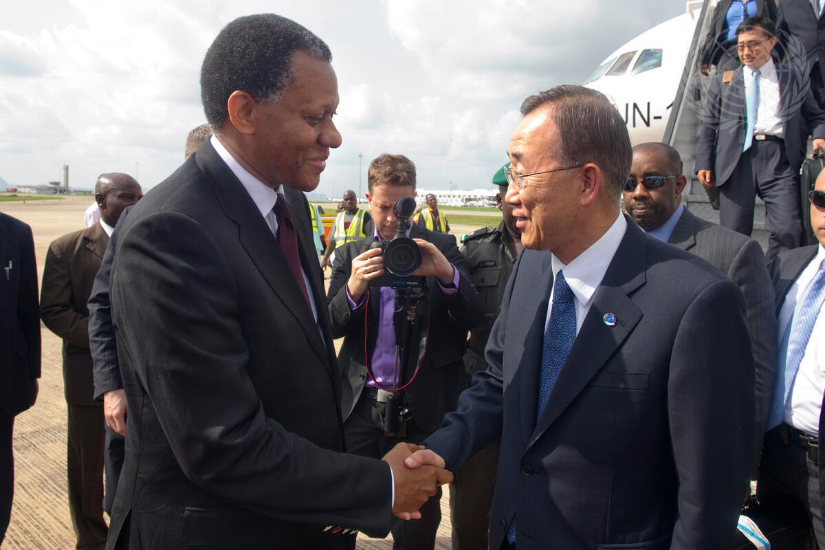 Odein Ajumogobia, Foreign Minister of Nigeria, welcomes Secretary-General Ban Ki-moon (right) upon his arrival to the country.