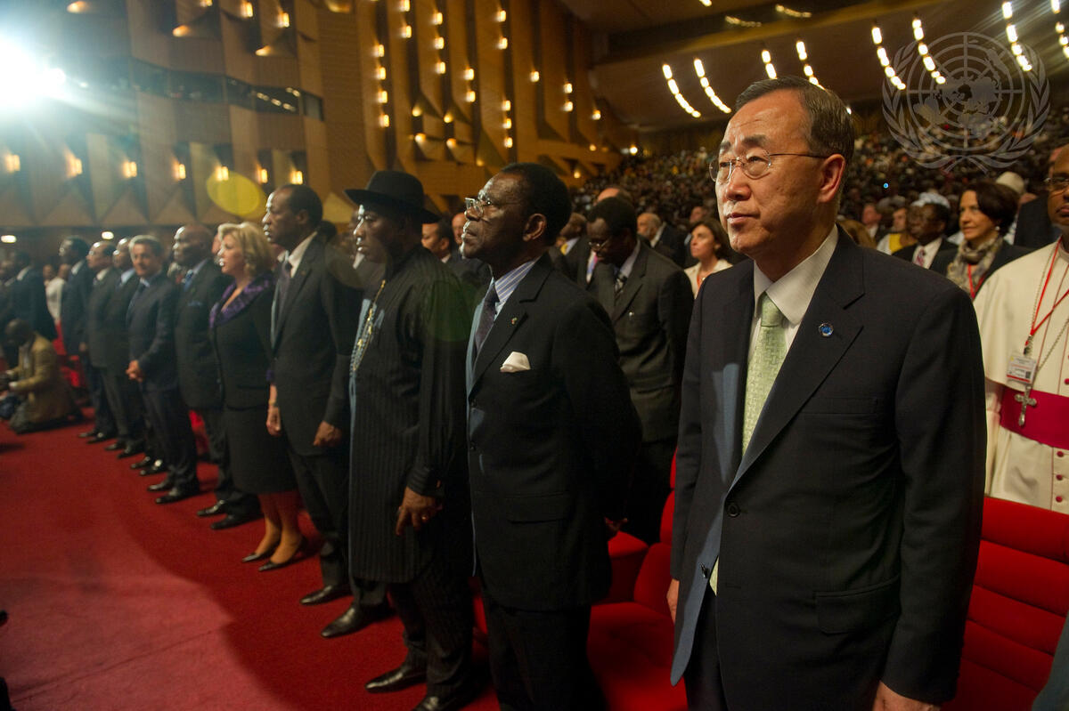 Secretary-General Ban Ki-moon is seen with other leaders and invited guests at the inauguration ceremony of Alassane Ouattara, President of Côte d’Ivoire.