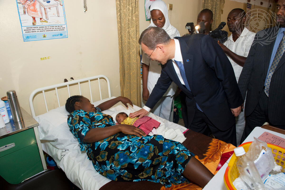 Secretary-General Ban Ki-moon visits a mother and her baby at the Maitama General Hospital in Abuja.