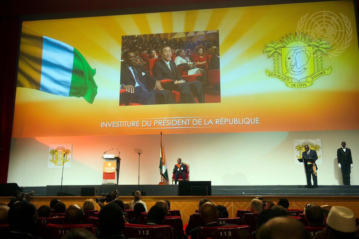 Alassane Ouattara (seated on stage), President of Côte d'Ivoire, is inaugurated during a ceremony in Ivorian capital Yamassoukro. Secretary-General Ban Ki-moon (shown on screen, right) travelled to Côte d'Ivoire to attend the ceremony.