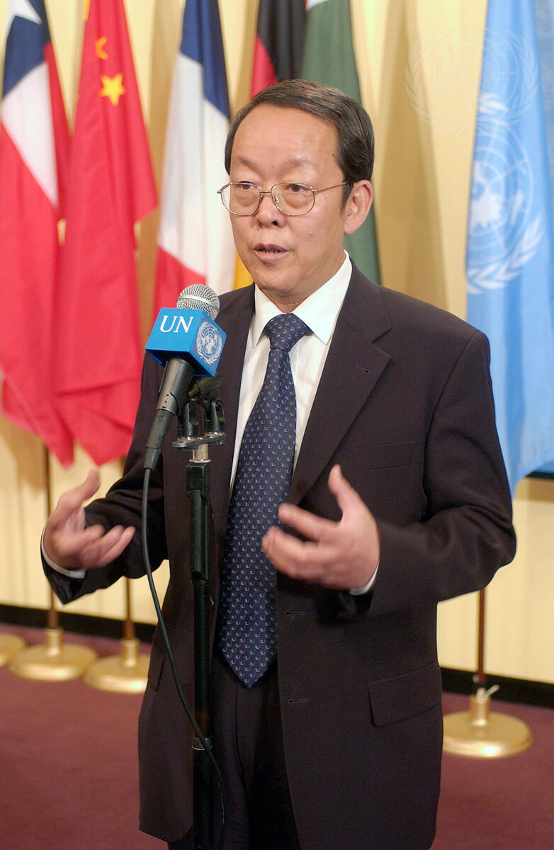 Ambassador Wang Guangya, Permanent Representative of China, addresses the press outside the Security Council chamber following consultations on the the situation in the Middle East, including the Palestinian question.