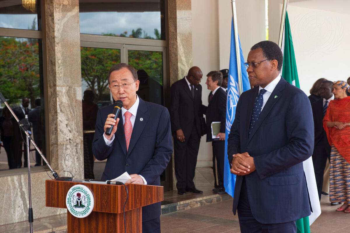 Secretary-General Ban Ki-moon speaks to the media in Abuja. Next to him is Goodluck Jonathan, President of Nigeria.