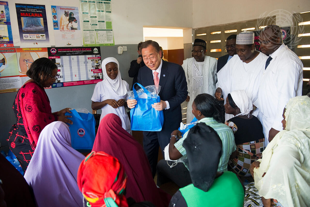 Secretary-General Ban Ki-moon (centre) visits the Maitama General Hospital in Abuja. In his remarks at the outset of his visit, Mr. Ban commended the commitment the Government of Nigeria has made to invest more in women's and children's health.