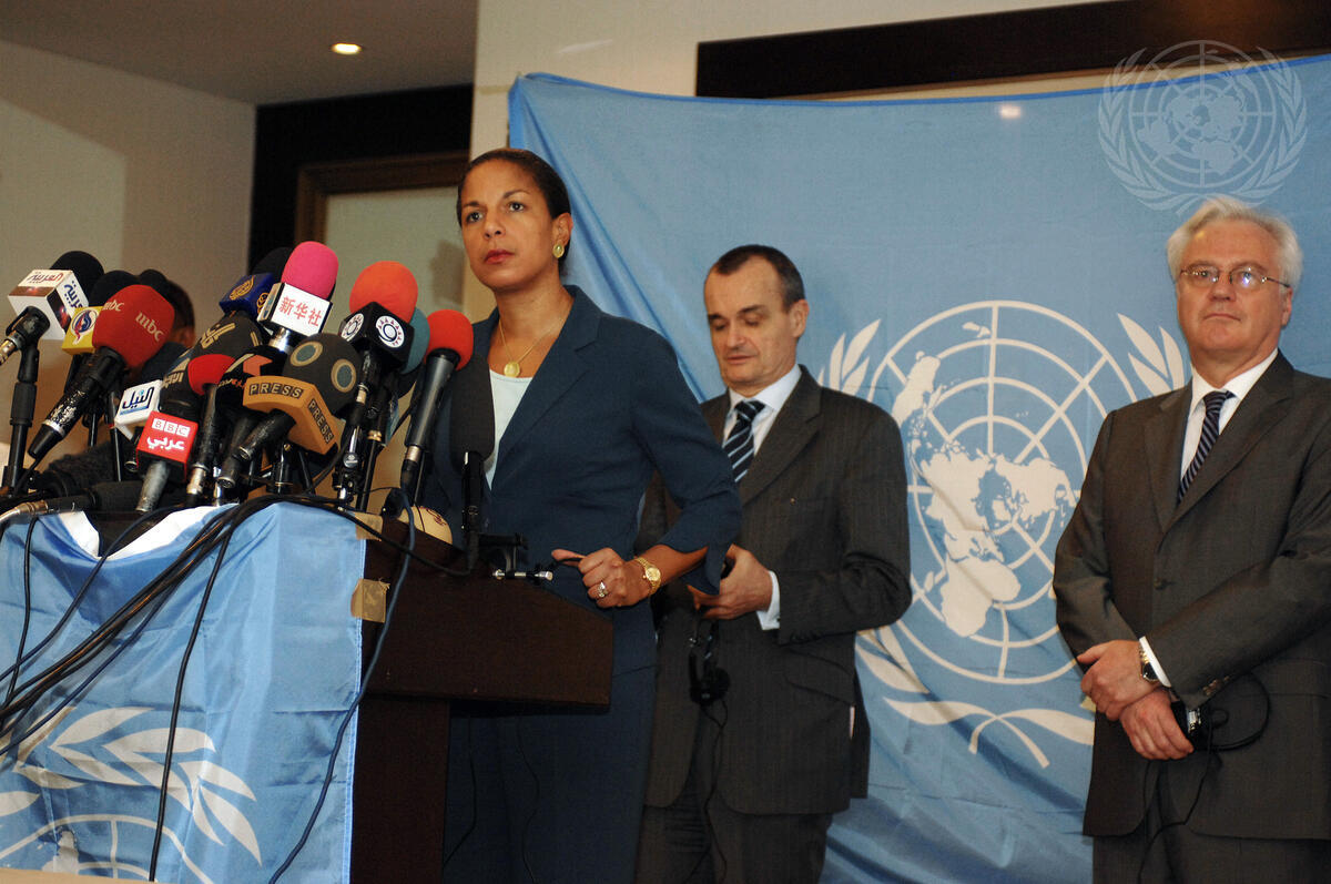 Susan E. Rice (at podium), Permanent Representative of the United States to the UN and Member of the Security Council, briefs reporters at the end of the Council’s second day in Khartoum, Sudan, alongside France and Russia’s Permanent Representatives, Gérard Araud (centre) and Vitaly I. Churkin. The visit of the Council comes just as news of fighting between the forces of the Government of Sudan and of newly-independent South Sudan has been reported in Abyei, a disputed border region.