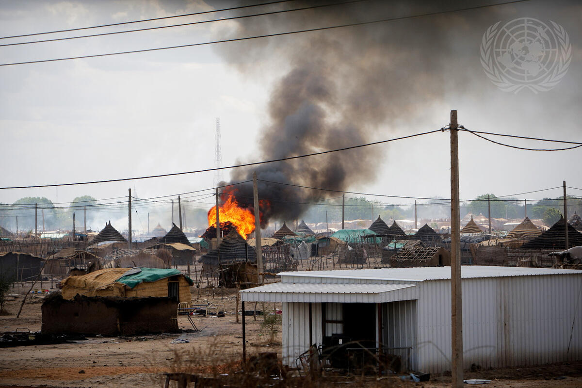 Smoke trails from burning homes in Abyei, the main town of the disputed Abyei area on the border of Sudan and newly independent South Sudan. In a statement today, the United Nations strongly condemned the burning and looting currently being perpetrated by armed elements in the area, following the seizure of Abyei town by Sudanese Government troops on 20 May.