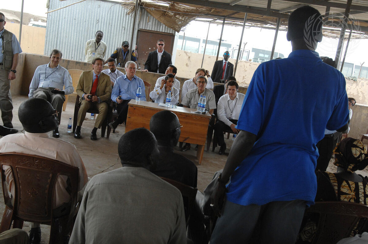Members of the Security Council listen to the testimony of a displaced Southern Sudanese at Mayo Camp for Internally Displaced Persons (IDP's), outside Sudan's capital, Khartoum. Pictured (front, left to right): João Maria Cabral, Deputy Permanent Representative of Portugal; Peter Wittig, Permanent Representative of Germany; Mark Lyall Grant, Permanent Representative of the United Kingdom; Susan E. Rice, Permanent Representative of the United States; Néstor Osorio, Permanent Representative of Colombia; and Ivan Barbalic, Permanent Representative of Bosnia and Herzegovina.