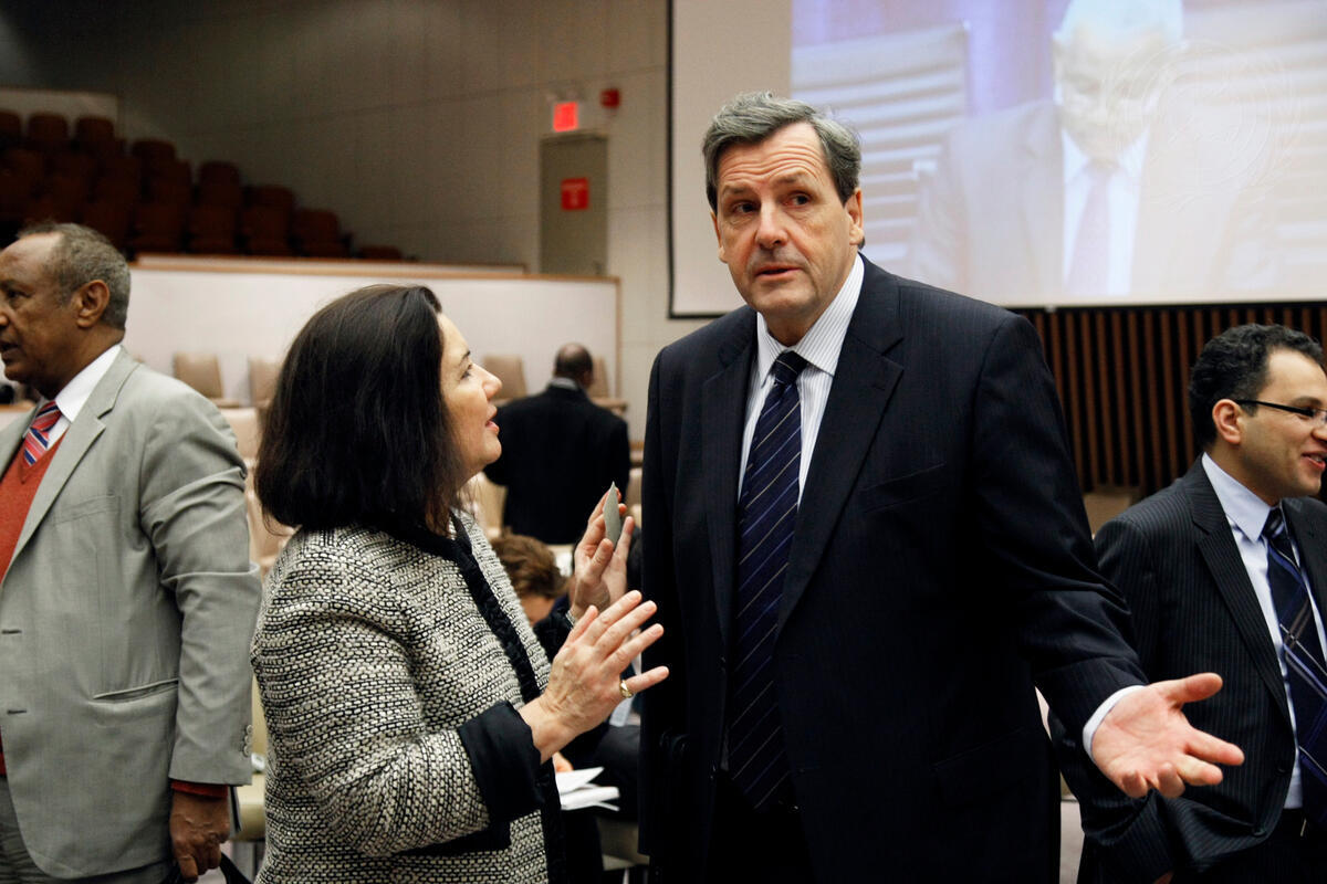 Maria Luiza Ribeiro Viotti (front, left), Permanent Representative of Brazil to the UN and President of the Security Council for February, converses with Alain Le Roy, Under-Secretary-General for Peacekeeping Operations, prior to the Council’s meeting on the results of the historic referendum in Southern Sudan. Over 98% of referendum voters decided on independence from Sudan.