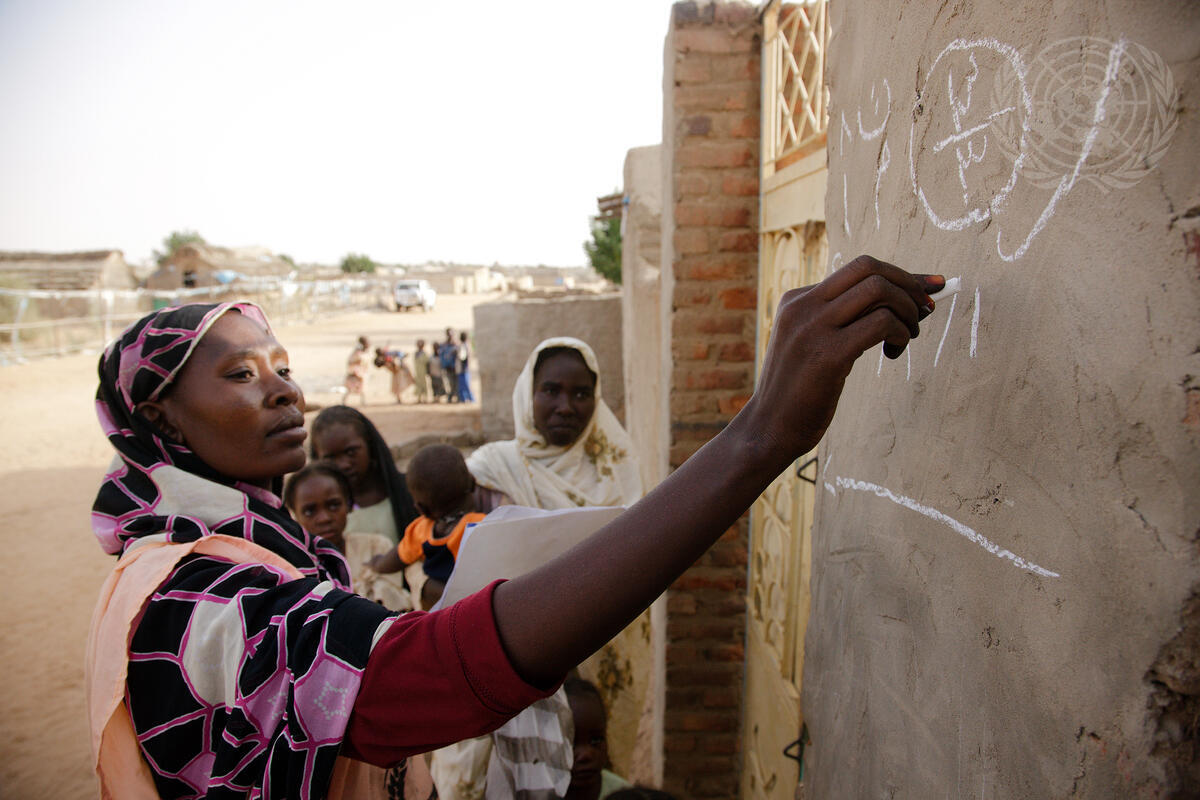 A woman in the Al Salaam Camp for Internally Displaced Persons (IDP) in Darfur educates people about the polio vaccination campaign being organized by the World Health Organization (WHO), the United Nations Children’s Fund (UNICEF) and the the Sudanese Ministry of Health.