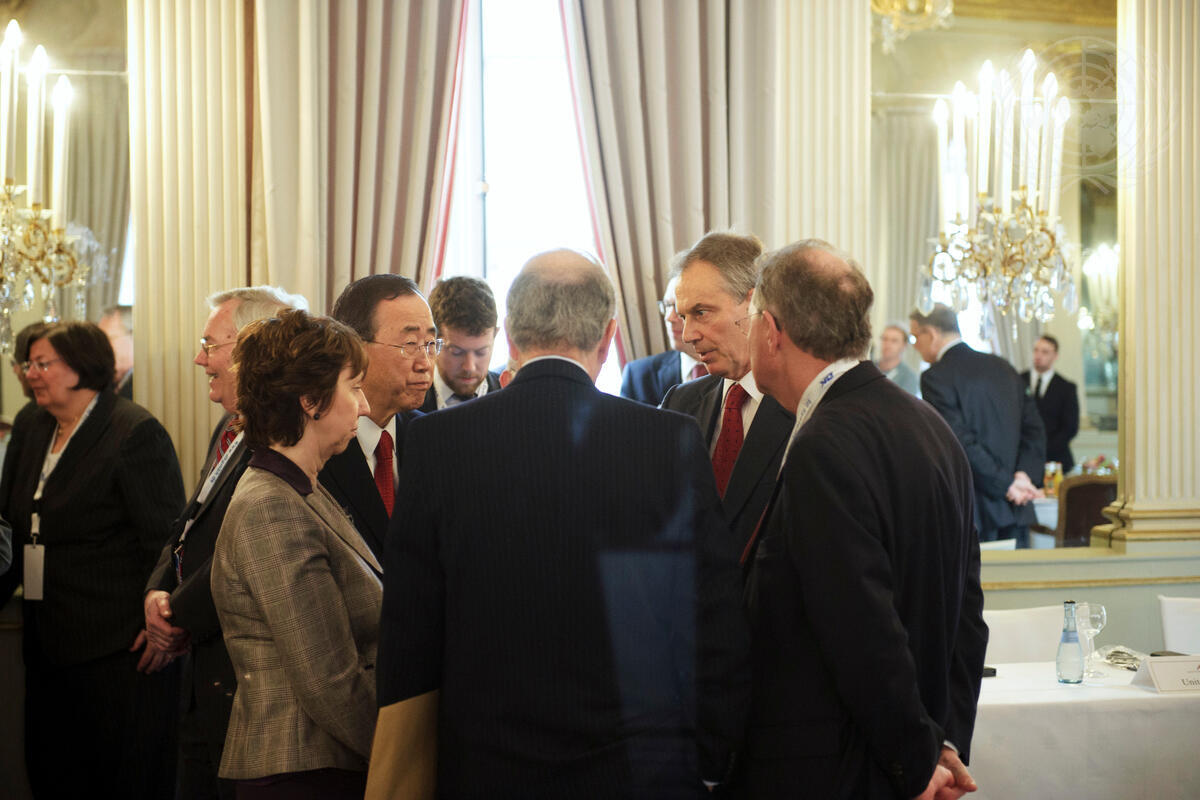 Secretary-General Ban Ki-moon (front, third from left) speaks with fellow members of the Middle East Diplomatic Quartet, including Catherine Ashton (left of Mr. Ban), High Representative of the European Union for Foreign Affairs and Security Policy, and Tony Blair (second from right), Special Envoy of the Quartet, in Munich, Germany. Also pictured is B. Lynn Pascoe (left), Under-Secretary-General for Political Affairs