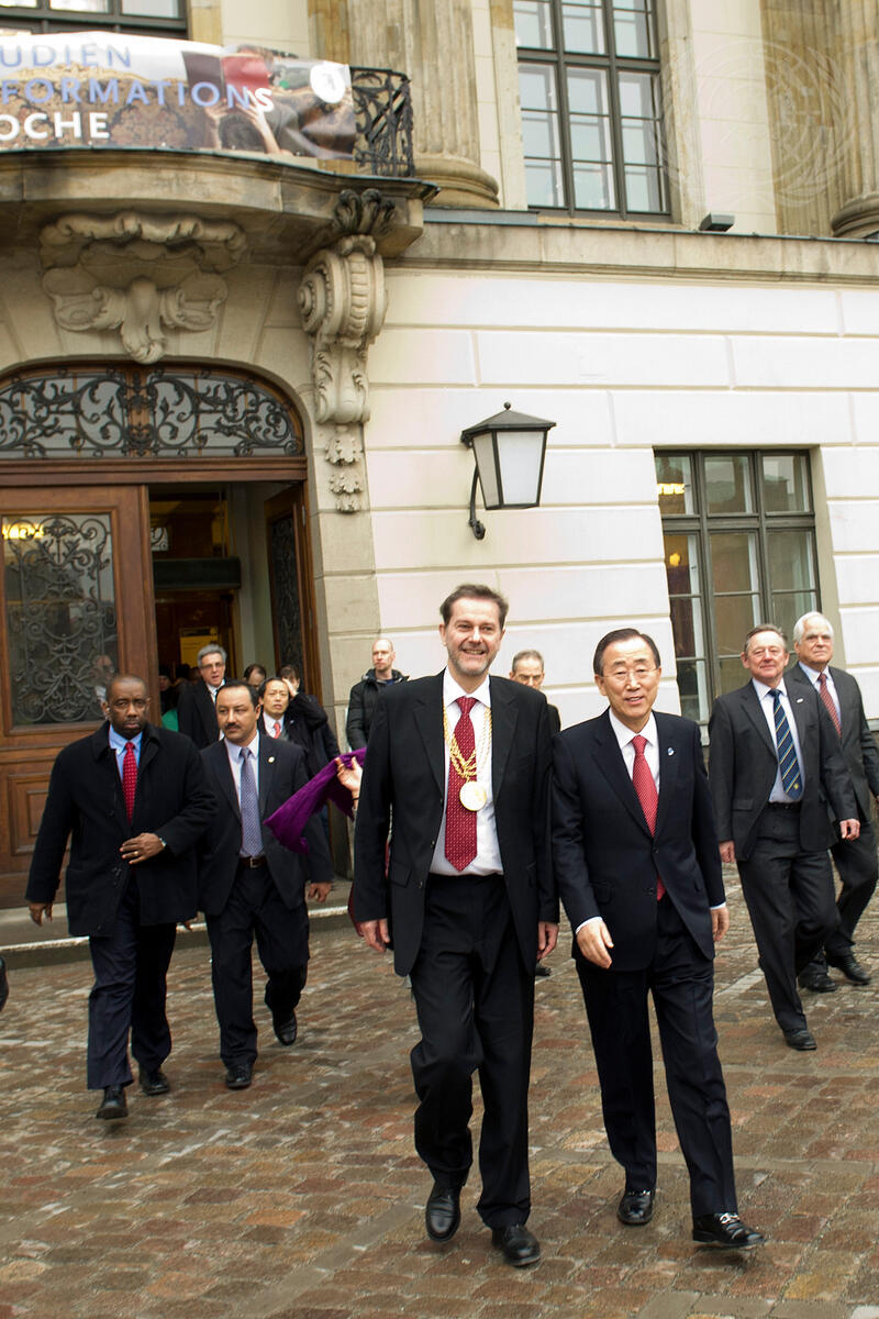 Secretary-General Ban Ki-moon (front, right) leaves Humboldt University of Berlin, in Berlin, Germany, escorted by the University’s president, Jan-Hendrik Olbertz (left of Mr. Ban), after delivering a lecture entitled ""The UN and the Modern World”.