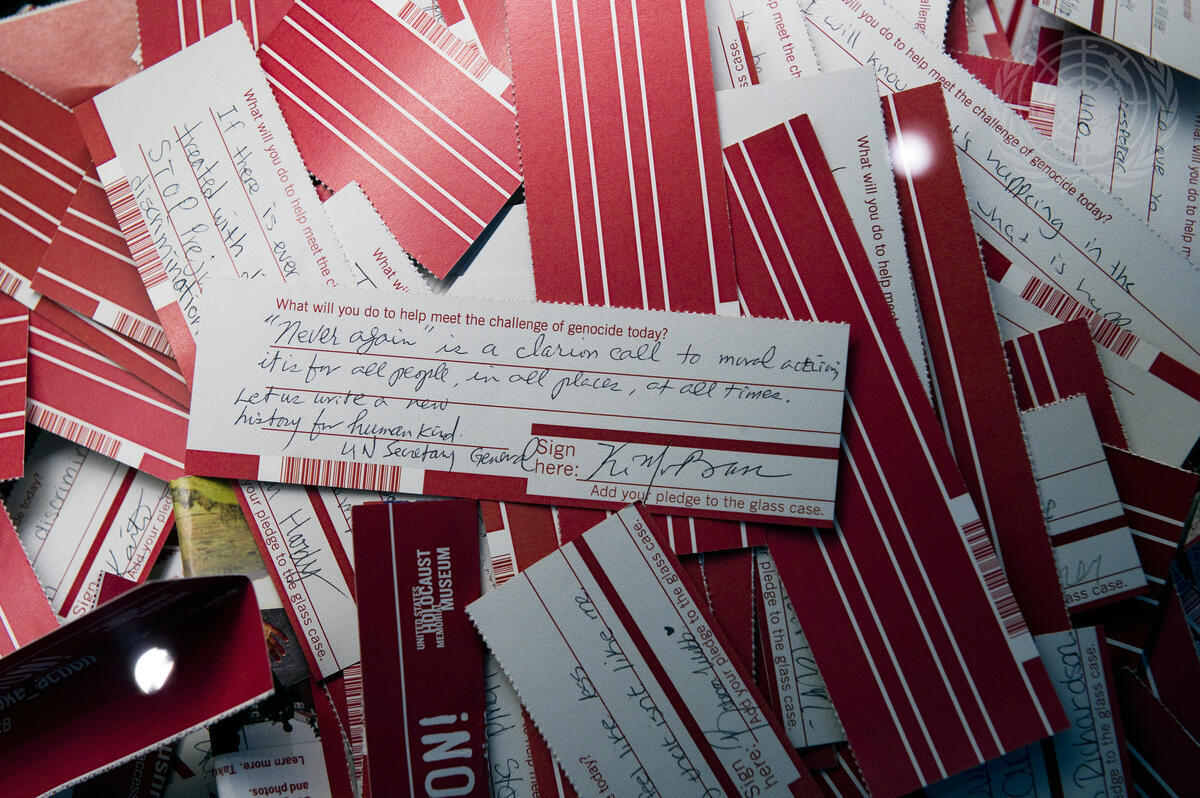 A close-up of Secretary-General Ban Ki-moon’s “pledge to prevent genocide”, written at the United States Holocaust Memorial Museum, which reads, “‘Never again’ is a clarion call to moral action; it is for all people, in all places, in all times. Let us write a new history for humankind.”