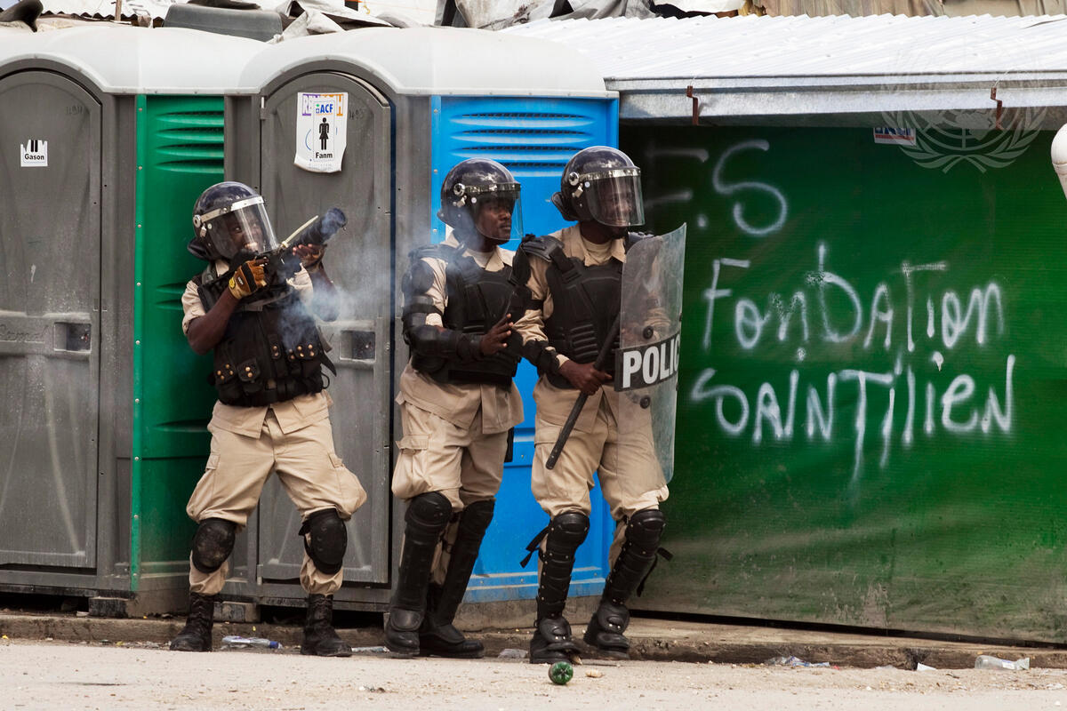 Local police fire tear gas at a group of approximately 70 rock-throwing protesters in Port-au-Prince, Haiti. The protesters took to the gates of the National Palace to demand that Haitian President René Préval step down from office today, 7 February, the constitutionally-decreed end date for a presidential term. Emergency measures, however, have been voted in to extend Mr. Préval’s presidency to May 2011 when an elected successor will be able to take office.