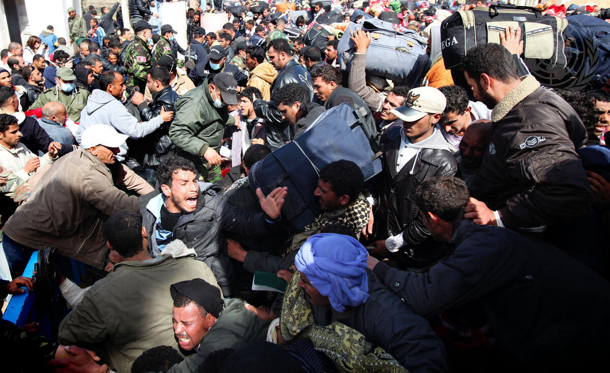 A heaving crush of thousands of people anxious to leave the insecurity of Libya inch closer toward the Tunisian border and toward immigration and custom officials. Most are young men, principally migrant workers from Tunisia and Egypt, desperate to go home or find shelter and safety across the border. After several nights sleeping out in the open, many are exhausted and hungry. The Tunisian Red Crescent was on hand to provide medical support for all those in need. Officials from the UN High Commission for Refugees (UNHCR) were also waiting on the Tunisian side of the border, supporting the Tunisian authorities and aid organizations.