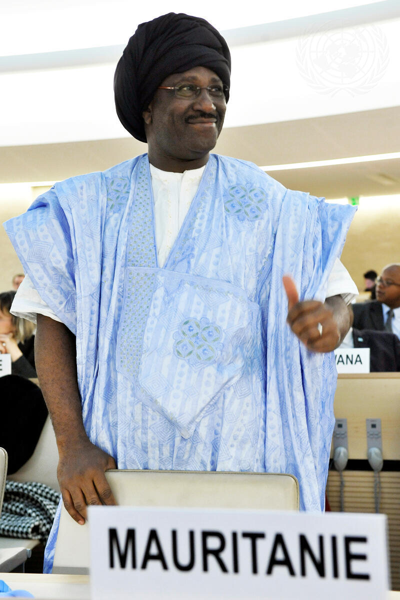 Delegates in traditional dress, including the representative from Mauritania, attend the presentation of the Human Rights Council's annual report during the 16th session of the Council.