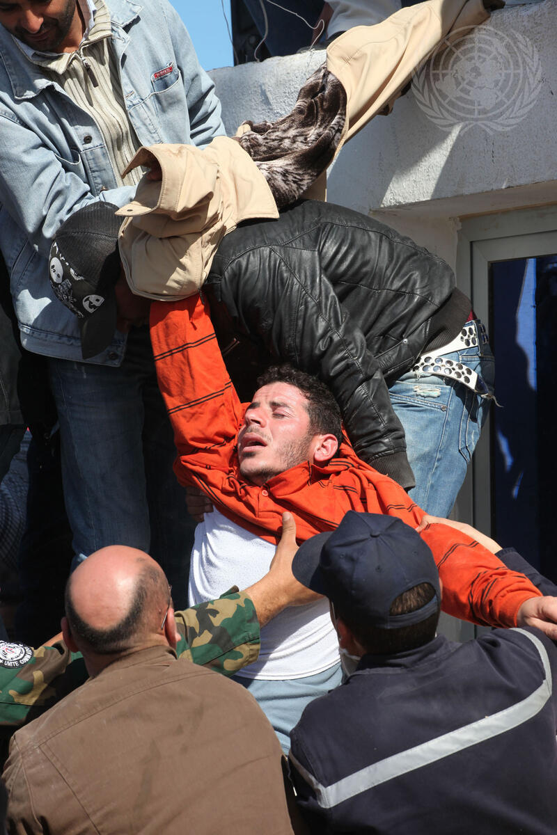 At the Tunisia-Libya border, a man is assisted after being pulled from a crowd of thousands of people anxious to leave the insecurity of Libya. Most in the crowd are young men, principally migrant workers from Tunisia and Egypt, desperate to go home or find shelter and safety across the border. After several nights sleeping out in the open, many are exhausted and hungry. The Tunisian Red Crescent was on hand to provide medical support for all those in need. Officials from the UN High Commission for Refugees (UNHCR) were also waiting on the Tunisian side of the border, supporting the Tunisian authorities and aid organizations.
