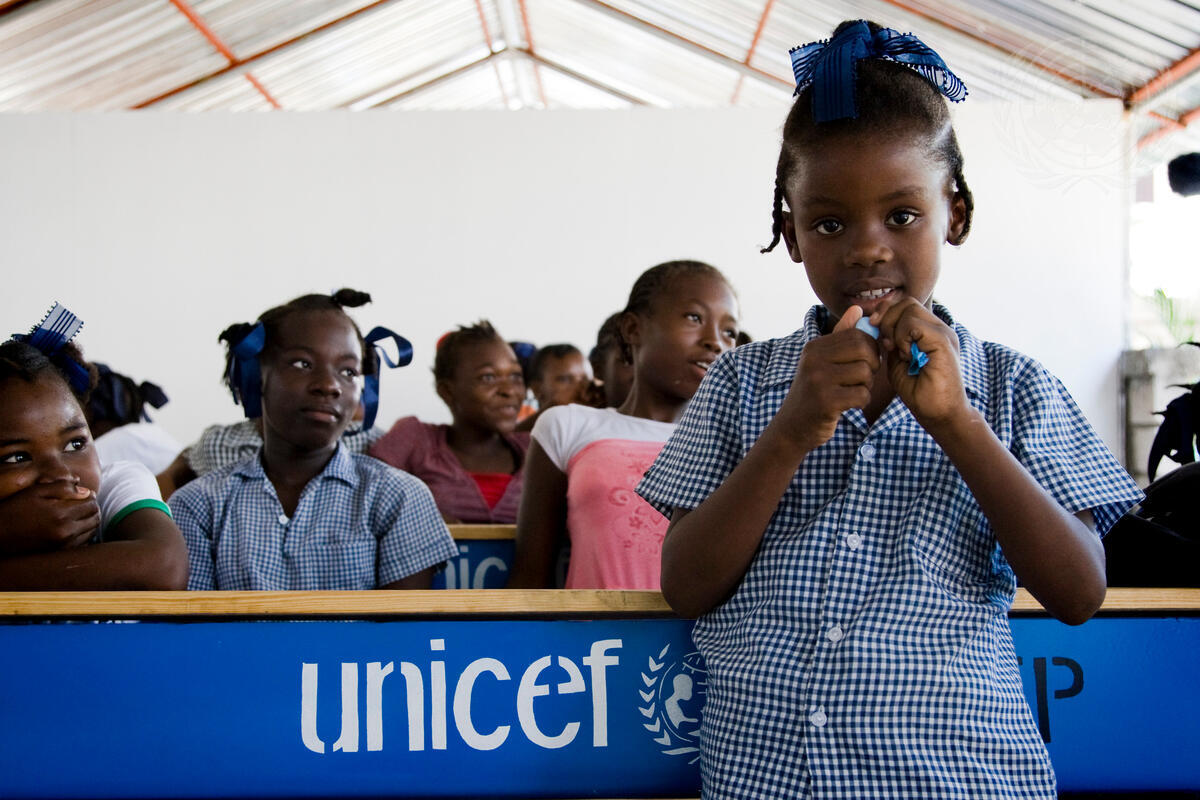 Schoolchildren after the inauguration of the Celie Lilavois School in Port-au-Prince. The school was destroyed in the January earthquake and rebuilt by UNICEF's construction unit in time for the beginning of the school season.