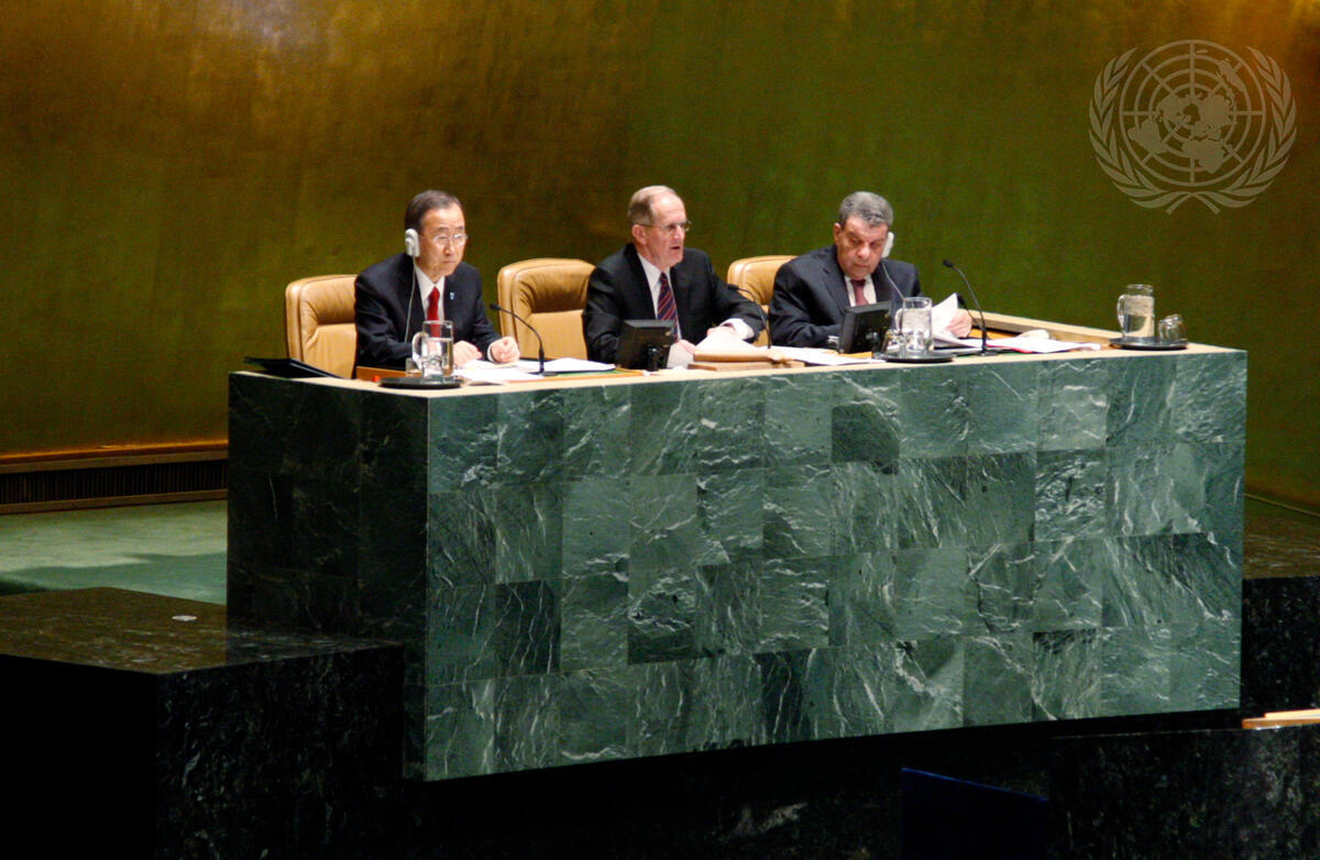 From left: Secretary-General Ban Ki-moon; Joseph Deiss, President of the sixty-fifth session of the General Assembly; and Muhammad Shaaban, Under-Secretary-General for General Assembly Affairs and Conference Management; during the Assembly’s special session on the crisis in Libya. During the session Assembly Members adopted resolution A/65/L.60, suspending Libya from the Human Rights Council for the deadly attacks committed by its leadership against masses of civilian protesters.
