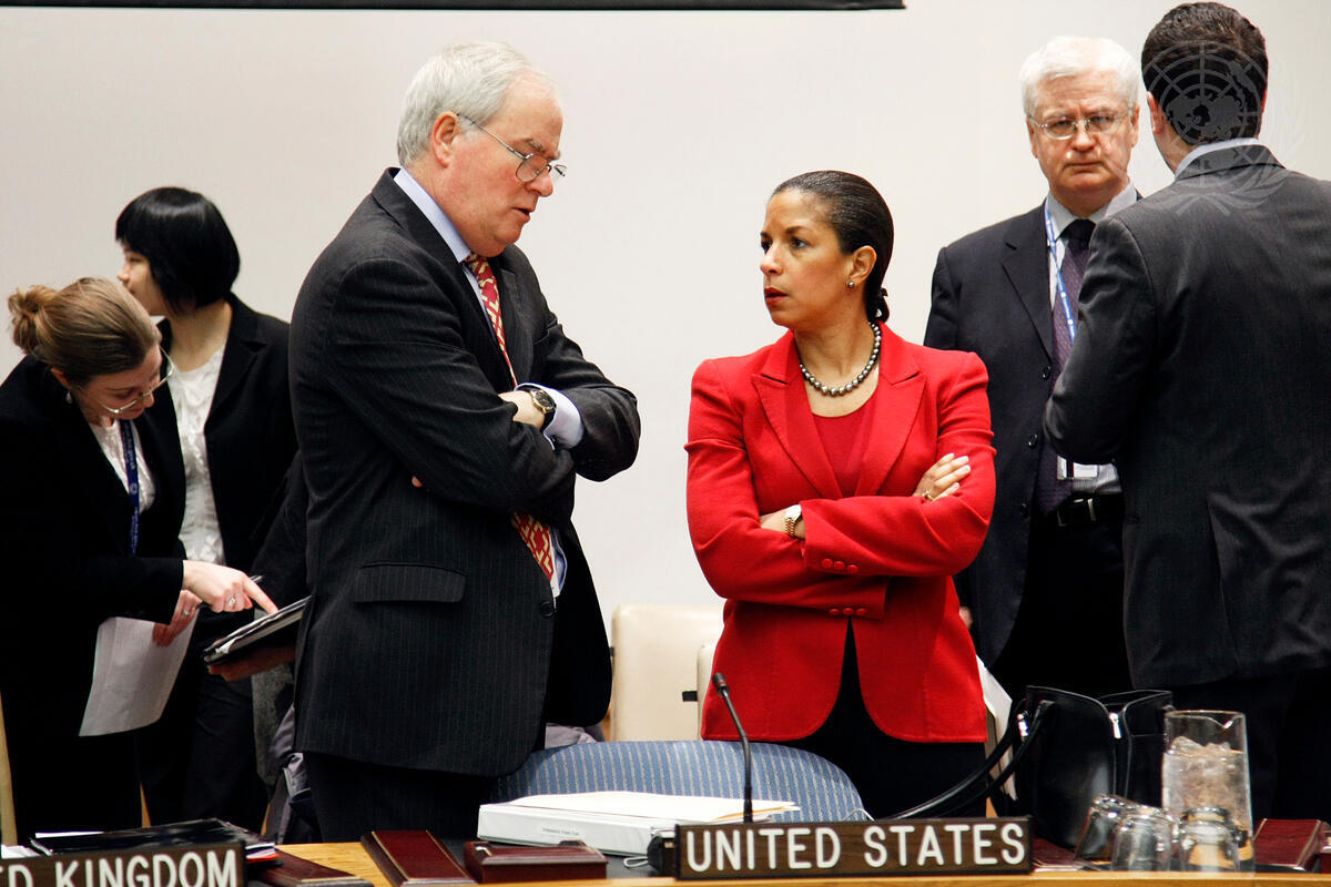 Susan E. Rice (centre right), Permanent Representative of the United States of America to the UN, converses with Mark Lyall Grant, Permanent Representative of the United Kingdom to the UN, prior to the Security Council’s meeting on the results of the historic referendum in Southern Sudan. Over 98% of referendum participants voted for independence from Sudan.