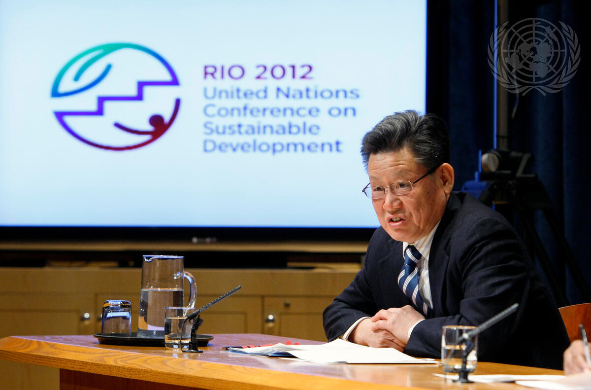 Sha Zukang, Under-Secretary-General for Economic and Social Affairs, briefs on the upcoming UN Conference on Sustainable Development, slated for June 2012 in Rio de Janeiro. Behind Mr. Sha is the “Rio 2012” conference logo.