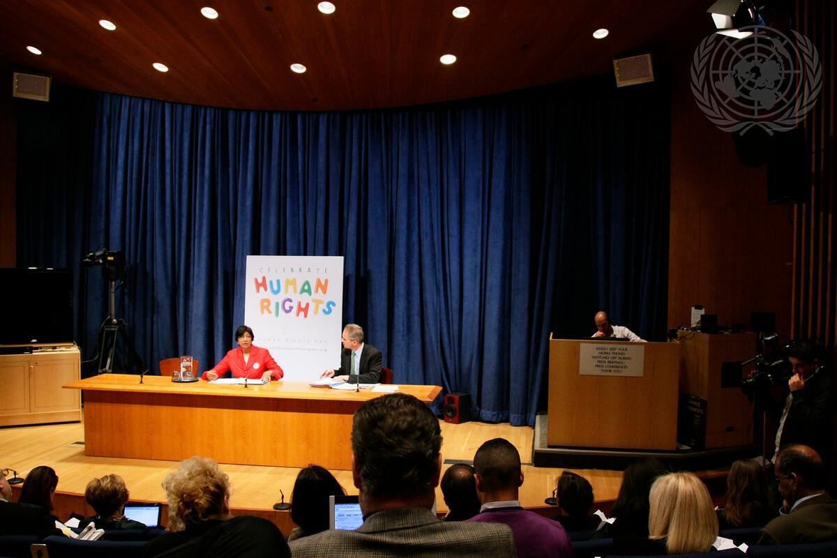 A wide view of the press conference held by UN High Commissioner for Human Rights Navi Pillay (left) on the eve of Human Rights Day. Ms. Pillay briefed correspondents on the state of human rights in the world and the successful campaigns and events organized to commemorate the Day. On right is Martin Nesirky, Spokesperson for the Secretary-General.